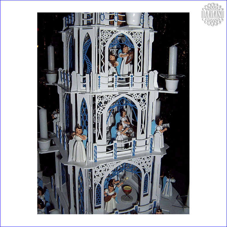Die ersten Pyramiden verkauften wir noch unbestückt. Aber eine eigene Bestückung wäre doch auch schön - dachten wir uns. Und so entstanden im Jahre 2008 speziell für die gotische Weihnachtspyramide unsere Musikantenengel. Die Engel sind weiß und tragen goldene Instrumente. Die Figuren leben ausschließlich durch ihre Körperhaltung beim Musizieren. In ihrer schlichten Ausführung bilden sie einen guten Kontrast zu den farbigen, filigranen Pyramiden.