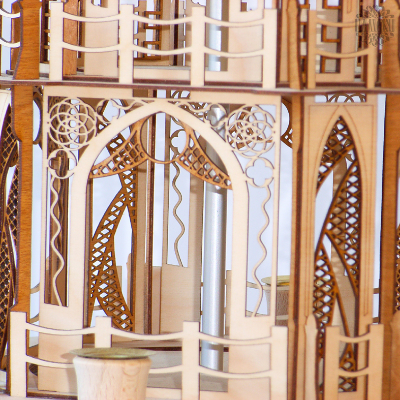 Auf eine Besonderheit möchte ich noch hinweisen. Unsere gotischen Pyramiden sind mit einem automatischen Flügelrad ausgestattet. Automatisch deshalb, weil man mit einem Handgriff alle Flügelblätter des Flügelrades in den gewünschten Winkel stellen kann. Damit wird die Drehgeschwindigkeit der Pyramide beeinflusst. Die Flügel sind über ein aufwendiges Zahnradsystem fest mit der Nabe verbunden und doch beweglich. Übrigens, die gesamte Mechanik ist aus Holz gefertigt. Flügelrad und Nabe bestehen aus 109 Einzelteilen.